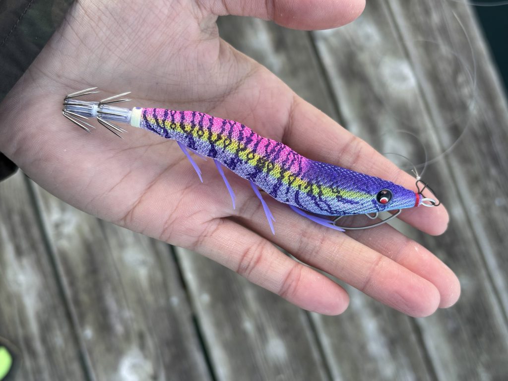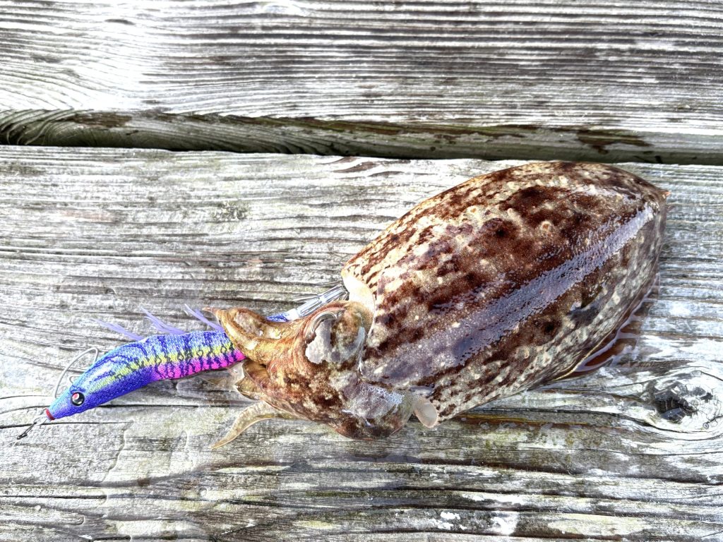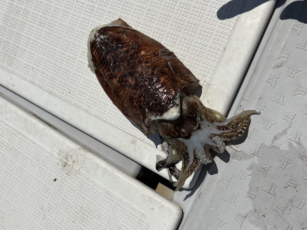 私は朝一コウイカが釣れました。渡船で帰る際に船長が漁具の仕掛けをあげるとのことで、漁具の中にはコウイカが大漁でした。漁具にメスのコウイカを1つ入れておいて、オスを寄せているようでした。
